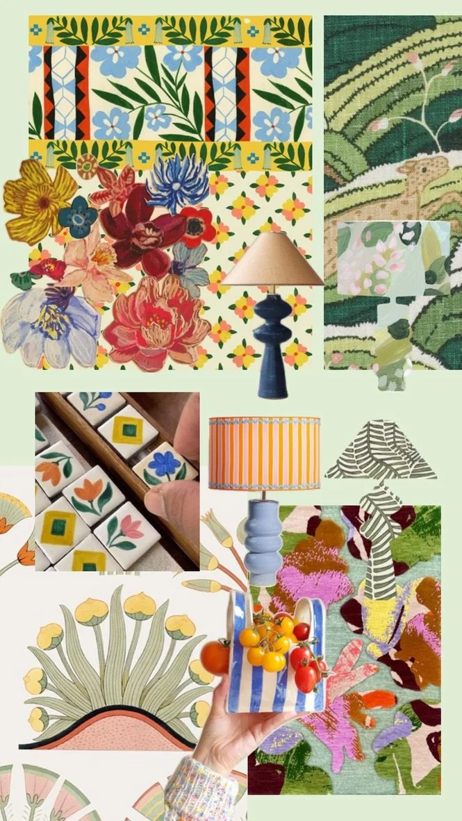 In a more practical sense I do have a couple goals or plans I am excited for in the upcoming months. I am going to try to teach more community arts classes. I have 2 lined up at Gertrude Herbert (a local arts center) and I have a couple I am trying to pull together at my newly renovated studio! I love teaching so if trying a new artsy thing is on your 2025 bingo card, please come join me! I am also taking some dream projects off of the back burner to focus on for upcoming collections. I want to keep it a bit of a surprise for now but just think of lights and tondos! Here is my visual mood board for the year- all things colorful, floral textiles, and pattern mixing on modern 70’s interior decor. I can’t wait to Find Joy through the year with you. Happy 2025 friends!