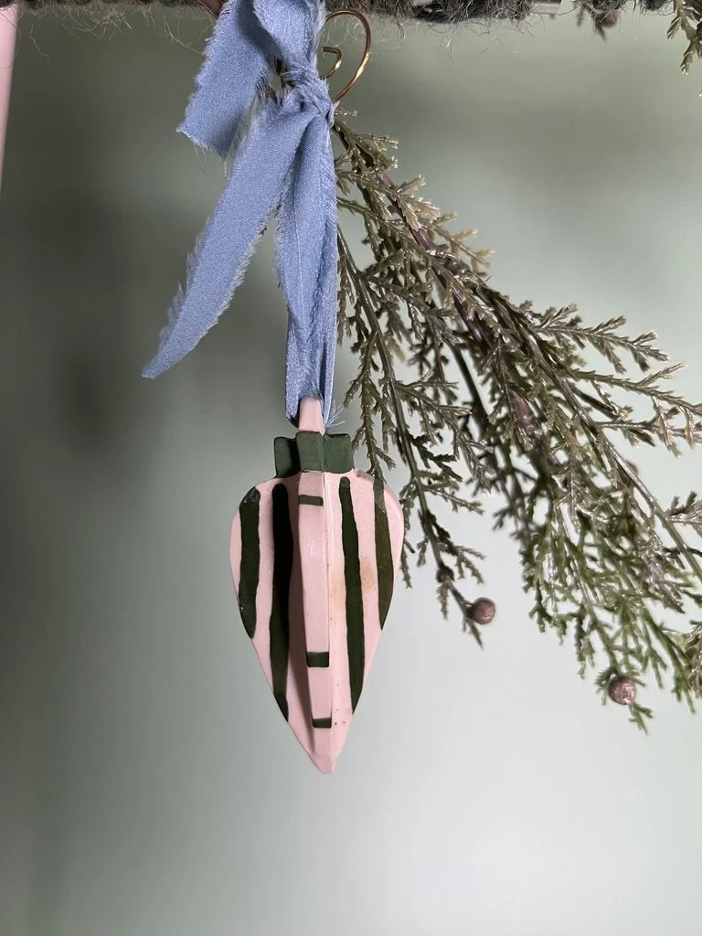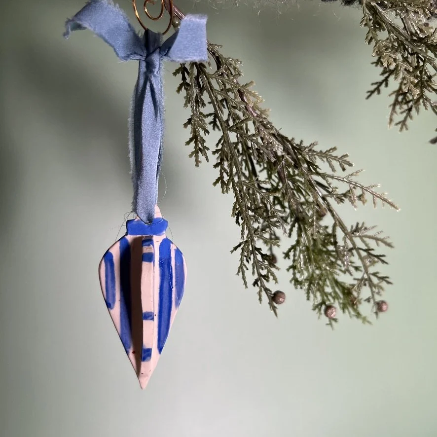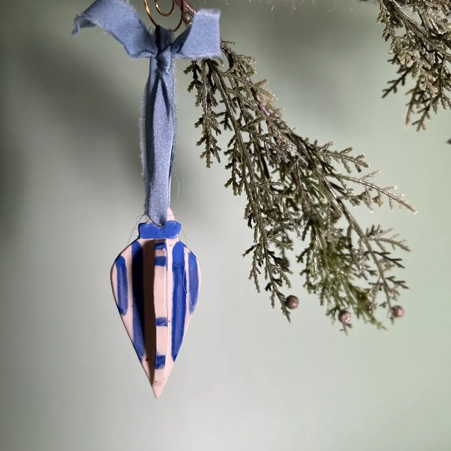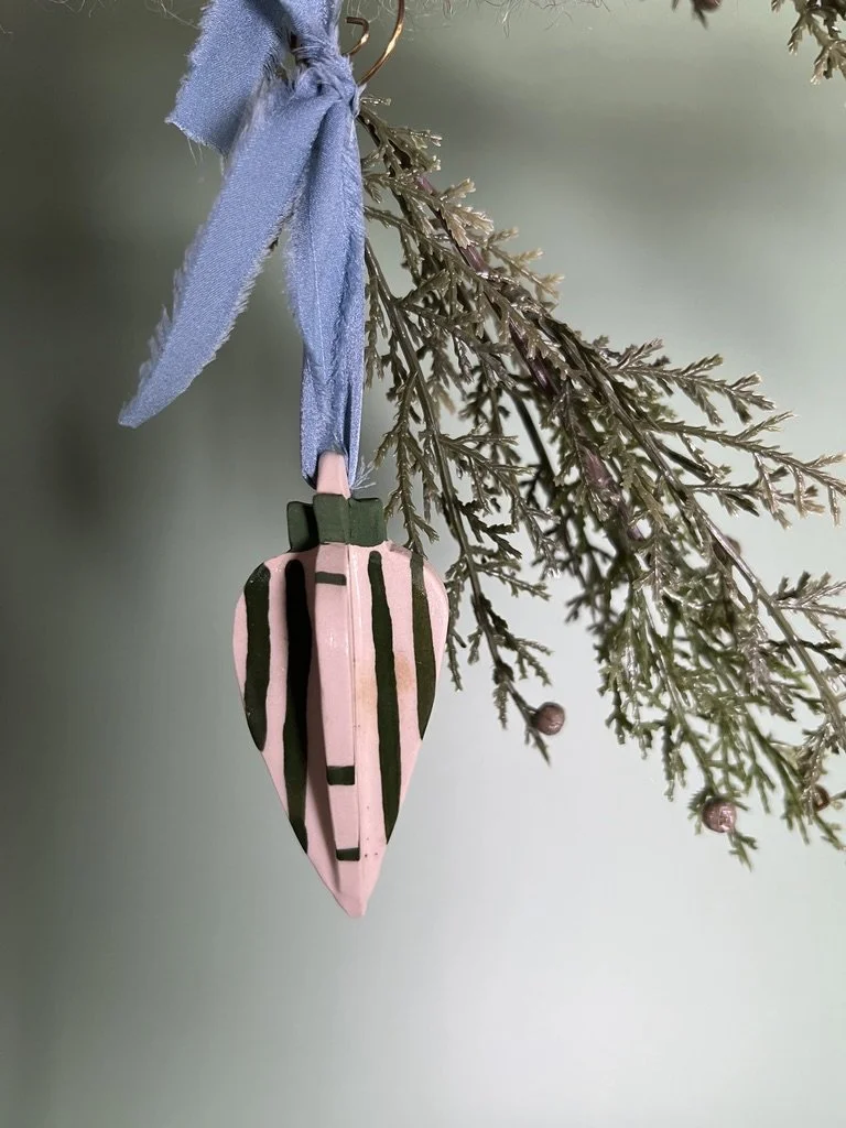Fine Art › Mid Mod Bulb Ornament Image 1 of 5 Image 2 of 5 Image 3 of 5 Image 4 of 5 Image 5 of 5 Mid Mod Bulb Ornament $20.00 Handmade white stoneware ornament with striped pattern.About 1 × 1 × 2 inches. Color: Blue Green Quantity: Add To Cart Added! Handmade white stoneware ornament with striped pattern.About 1 × 1 × 2 inches.